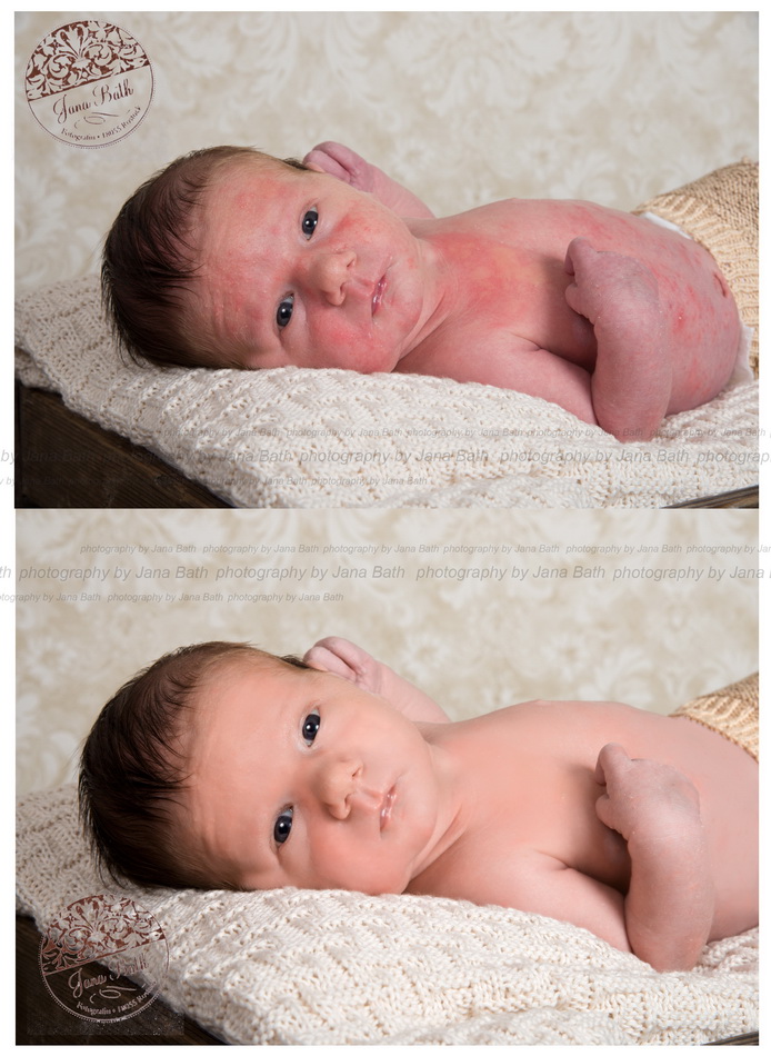 Es ist keine Ausnahme, dass ein Baby zum Fototermin Pickel und Pickelchen hat, aber sicher möchte man diese dann nicht auf dem fertigen Bildergebnis sehen. Eine natürlich Retusche durchzuführen, so dass zwar die Hautunreinheiten verschwinden, aber dennoch die kleinen Falten & Fältchen, sowie die Mimik des Babys erhalten bleibt, dauert Stunden und erfordert einen großen Erfahrungsschatz im Bereich der Bildbearbeitung.